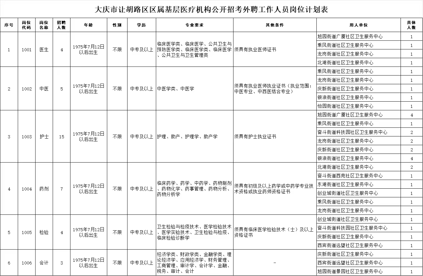 (四)具有符合招聘崗位要求的學(xué)歷、專業(yè)、年齡等條件,詳見(jiàn)《大慶市讓胡路區(qū)區(qū)屬基層醫(yī)療機(jī)構(gòu)公開(kāi)招考外聘工作人員崗位計(jì)劃表》(附件1);